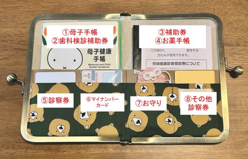 最低限必要な5つに加えて、お守りや診察券、歯科検診補助券を入れています。