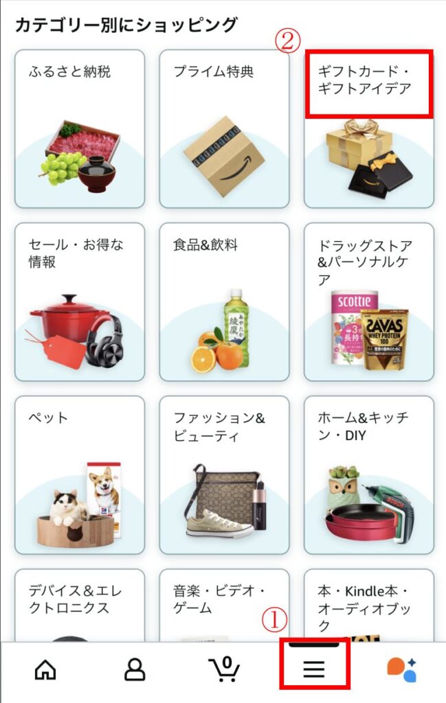 スマホでAmazonアプリを開いて下にある①の3本線を選択します。